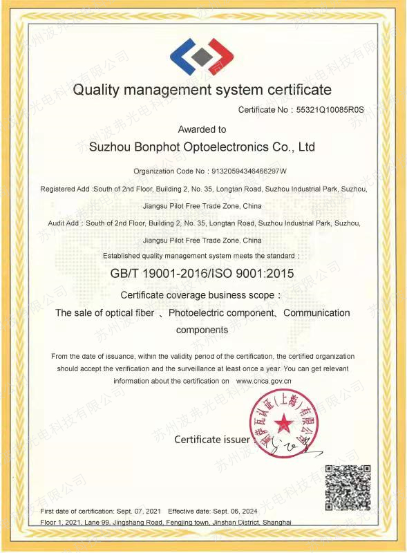 苏州leyu集团光电科技有限公司已于今日通过GB/T 19001-2016/ISO 9001:2015质量管理体系认证。