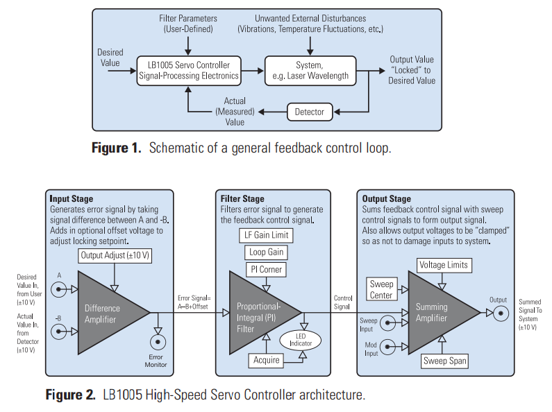 New Focus LB1005高速伺服控制器为执行反馈控制提供了关键的信号处理电子设备。 在波长锁定的情况下,误差信号是通过将一部分激光输出传输通过波长参考(例如气室或标准具)而产生的。 任何波长的不稳定性都会被转换为可以被光电探测器检测到的振幅电荷。 由此产生的误差信号由LB1005伺服控制器过滤,形成一个控制信号,发送回激光器。 (图1)