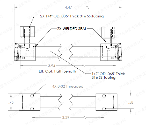 1.流通池有四个安装孔,底部有4-40螺纹。