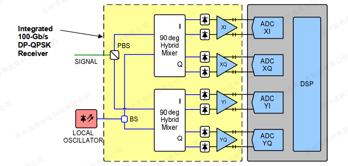 集成的100-Gb/s DP-QPSK接收器将两个90°光混合器与四对平衡光电探测器(PD)和四个线性TIA集成到单个蝶形封装中。 与其他不包含偏振分束器(PBS)和/或功率分束器(BS)的技术不同,Optoplex的接收器包含这两种技术以及光混合器、PD和TIA,以提供完全集成的解决方案,这将使用户受益 在完全消除光纤路由和倾斜管理方面。 集成接收器以高达32GBaud/s的波特率工作。