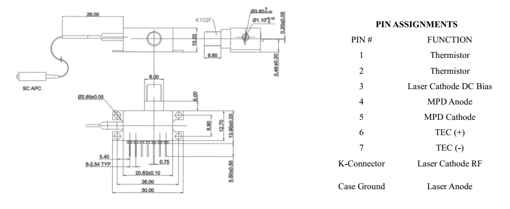DML系列直接调制激光二极管才有标准单模SMF-28e光纤输出(可定制保偏尾纤输出),阻燃涂层,900um套管,标准1m尾纤,5mm PIN脚间隔,已经SC/APC接头(可定制)。