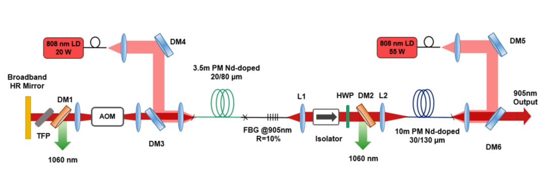 IXF-2CF-Nd-PM-30-130光纤用于放大器配置,以增加905 nm脉冲激光,在40 kHz的重复率下实现高达24 W的平均功率,脉冲持续时间为45 ns。采用倍频技术,在452nm处达到4.9W,在226nm处达到0.5W。